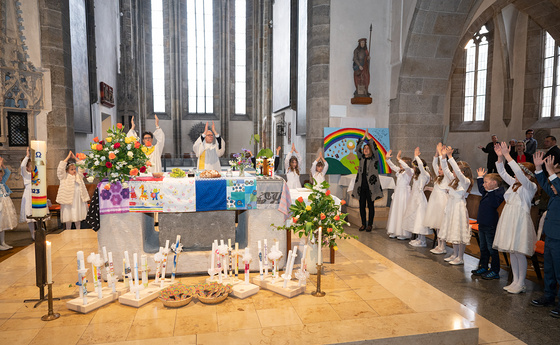Ein wunderbares Fest feierten 28 Kinder und ihre Familien am Sonntag vor Christi-Himmelfahrt: Nach dem Einzug mit den "Music Monkeys" entzündeten die Kinder ihre Taufkerzen und verkündeten freudig ihr Taufversprechen. In der stimmungsvollen Feier, die trotz voller Kirche ruhig und unaufgeregt verlief, standen der Empfang der Kommunion und die Freude darüber im Mittelplunkt.