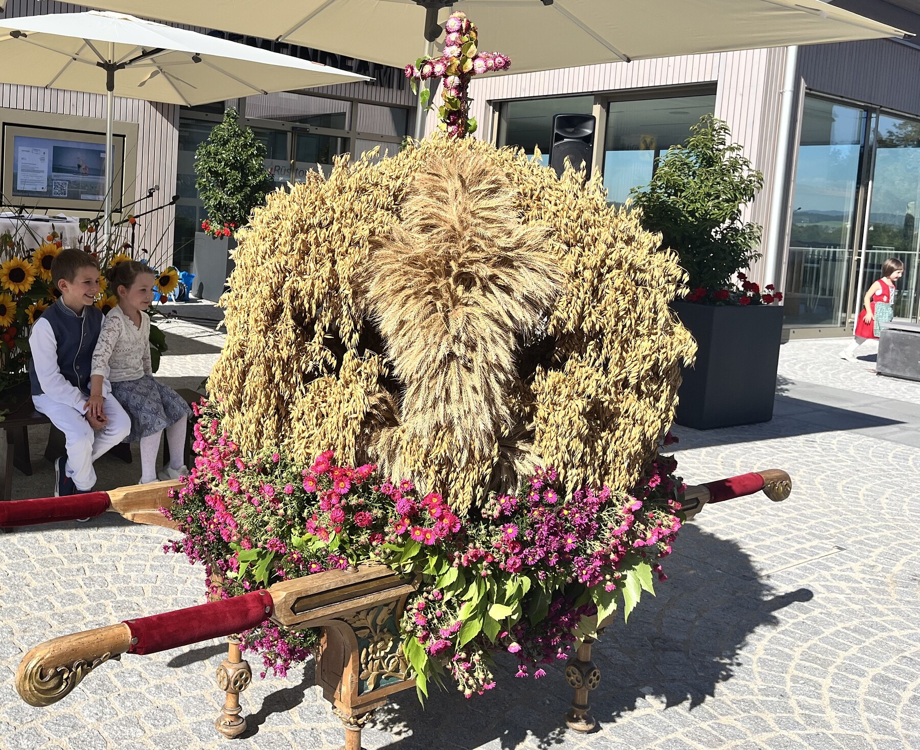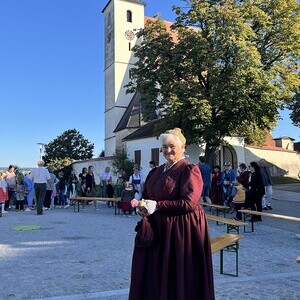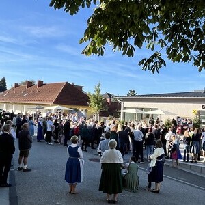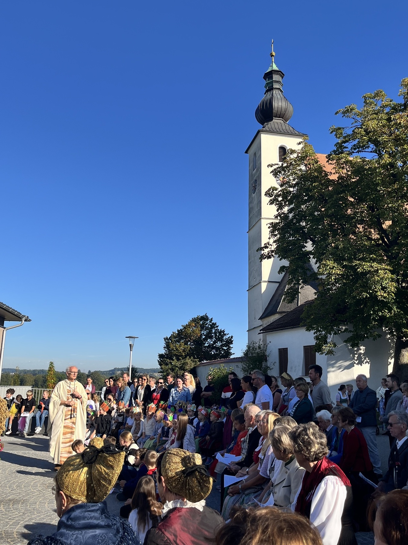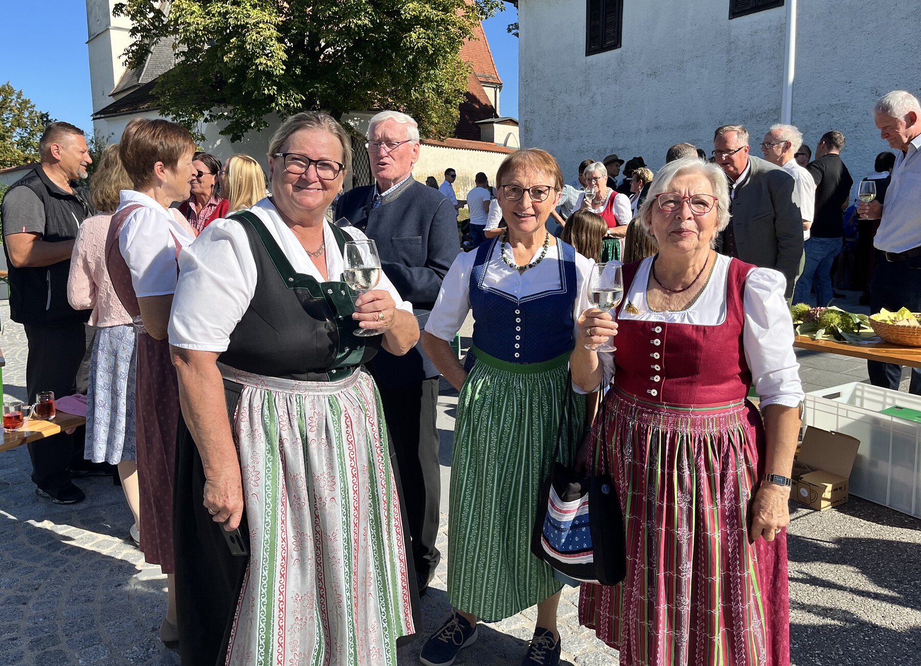 Im Anschluss an den Gottesdienst lud unser schön geschmückter Dorfplatz zum Verweilen ein. Bei Wein, Traubensaft und Brötchen – gebacken von Familie Lizelfelner – konnten wir das Fest in geselliger Runde ausklingen lassen.