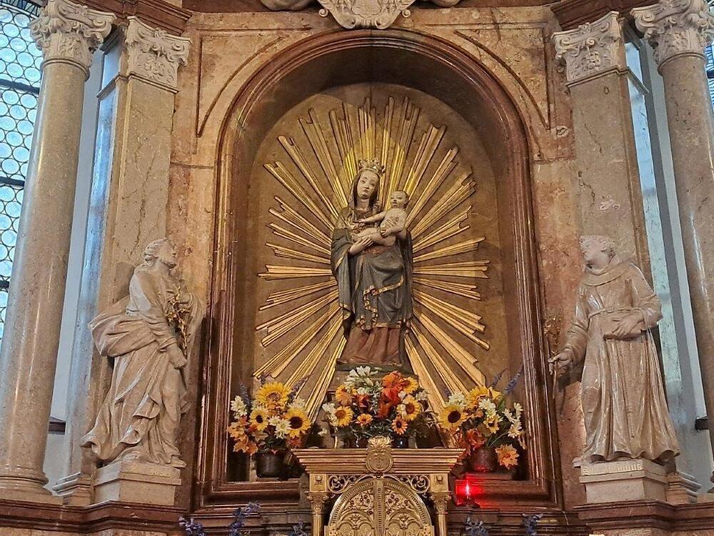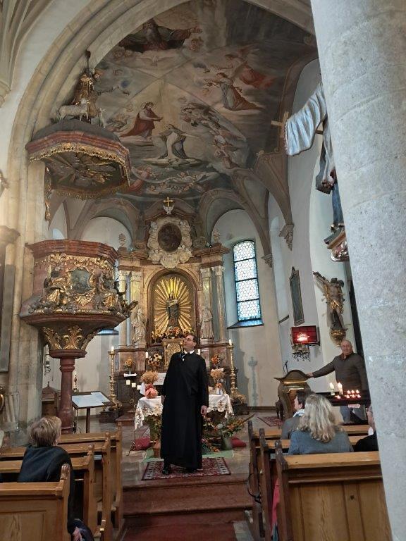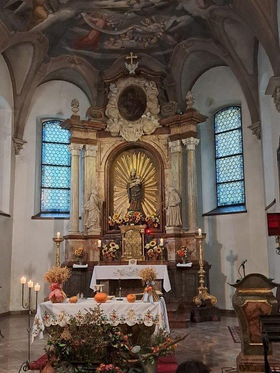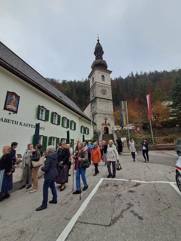 Der Name Maria im Schatten kommt wohl daher, dass die gotische, sehr sehenswerte Kirche am Fuße eines steilen Waldhanges errichtet worden ist. Heute liegt unmittelbar oberhalb der Kirche die Bundesstraße. In der Kirche mit der gotischen Marienstatue am Hochaltar begrüßte uns der Ortspfarrer der mit ca. 200 Katholiken kleinsten Pfarre Oberösterreichs. Wir feierten die Hl. Messe in unseren persönlichen und gemeinschaftlichen Anliegen. Nach einer kurzen Kirchenbesichtigung und der Möglichkeit des Kaufes von Rosenkränzen, die anlässlich des 680-jährigen Kirchenjubiläums geweiht worden waren, fuhren wir weiter in die alte Kaiserstadt Bad Ischl, wo sich der Nebel lichtete und die Sonne die Herbstfarben zum Strahlen brachte. Nach einem kurzen Spaziergang am Kongresspark vorbei bzw einem Flanieren entlang der Promenade zum Cafe Zauner nahmen wir im k.u.k. Hofwirt das Mittagessen ein. So gestärkt kehrten wir nach einem kurzen Rundgang zum Autobus zurück, der uns sicher ins Almtal heimbrachte.