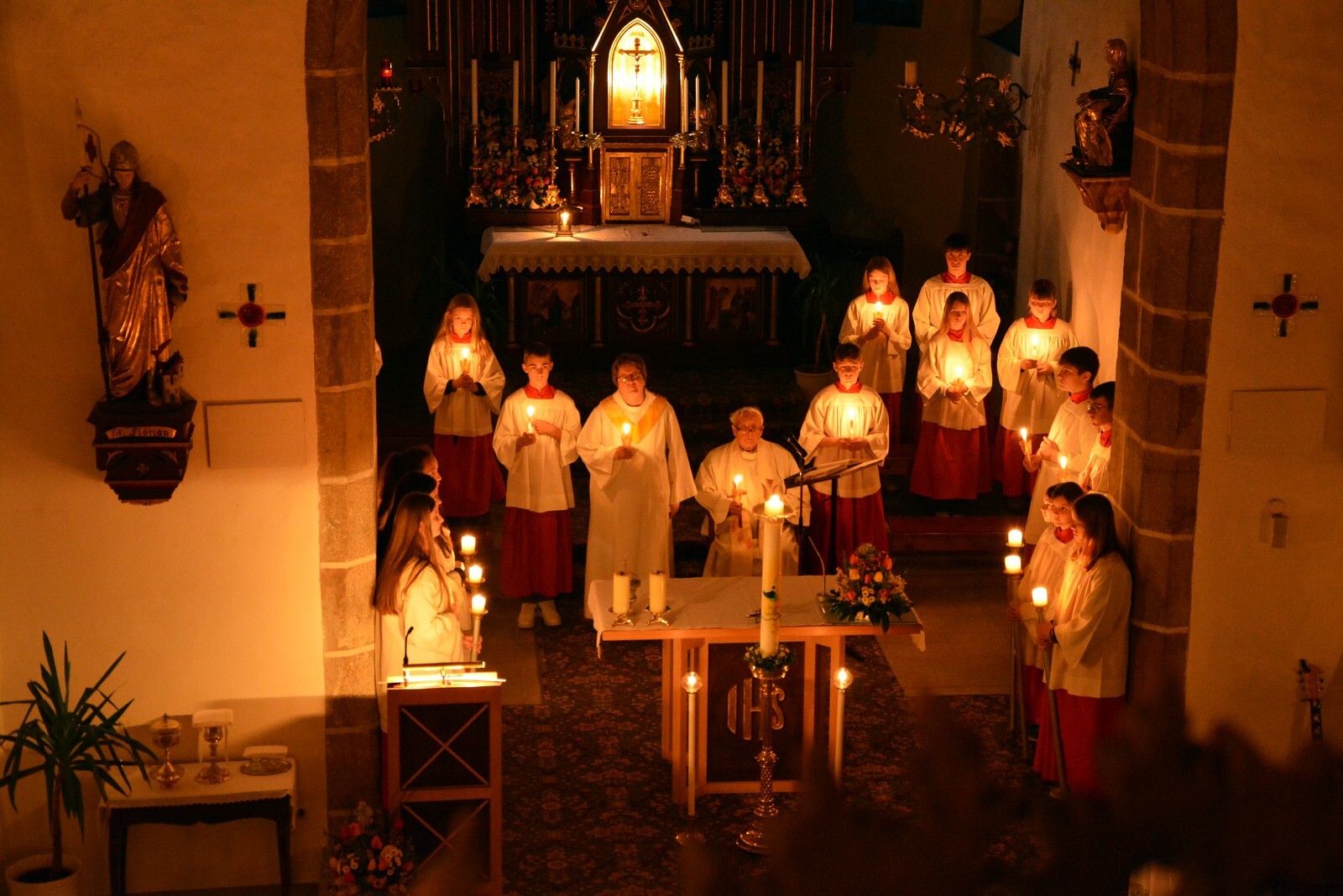 Die Osternacht wurde wieder sehr stimmungsvoll gefeiert. Die am Osterfeuer entzündete Osterkerze wurde in die dunkle Kirche getragen und erleuchtete mit ihrer Flamme den Kirchenraum.